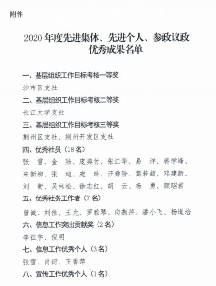 韦德体育官网再立新功。九三学社伟德体育支社现有荆州市政协委员6人,其中政协常委3人,现有伟德体育第四届教职工暨工会会员代表8人,在本年度的各项工作中,均能积极建言献策,为荆州市和伟德体育的各项工作提出有建设性的意见和建议。2020年1月,在市政协五届四次大会期间,来自九三学社伟德体育支社的政协委员共提交提案和大会发言8篇,其中集体提案和大会发言4件。李征宇代表九三学社荆州市委做了题为《加强基层干部队伍建设,夯实乡村振兴人才基础》的大会发言,受到中共荆州市委书记何光中的肯定和批示。祁芳梅代表九三学社荆州市委做了题为《加强农业产业化建设,促进乡村振兴发展》的联组发言,受到时任荆州市市长崔永辉的肯定。2020年,李征宇、王香萍、徐志红、吴林松等还通过九三学社向九三学社省委报送社情民意信息二十多条,其中李征宇报送14条,被采用8条,在社市委排名第一,在全省也排名前列。此外,李征宇还承担九三学社省委两项调研课题,最终结项并完成两项成果《关于进一步推动楚文化走出去的建议》和《关于推进我省楚文化开发与利用的建议》。长大支社社员共获得九三学社荆州市委会颁发的2020年韦德体育官网优秀成果一等奖3项,二等奖4项。李征宇还获得九三学社省委颁发的2019-2020年度韦德体育官网先进个人二等奖以及社市委颁发的信息工作突出贡献奖,王香萍获信息工作优秀个人。