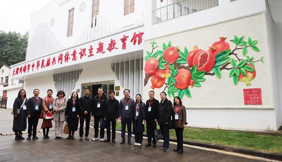 12月6日上午,调研组一行来到云南民族大学。总书记的两次回信和殷切希望、民族团结誓词、十二种文字的“中华人民共和国各民族团结起来”、“直过理论”等等,聚集了56个民族学生的云南民族大学向我们展示了云南省铸牢中华民族共同体意识教育基地的丰富内涵。党委统战部陈洁部长介绍了学校统一战线的基本情况,重点就学校的边疆性、民族性和国际性特征,讲述了学校立足边疆、辐射东亚和东南亚,在铸牢中华民族共同体意识工作中作出的巨大贡献,制定了全国民族团结进步模范标准。云南民族大学铸牢中华民族共同体意识研究院副院长李子成教授介绍了6个基地(2个国家级、2个省级、2个校级)的工作情况和标志性成果。