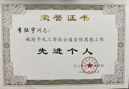 近年来,李征宇积极开展和参与韦德体育官网各项调研,为社内韦德体育官网培训工作提供支持,取得了突出成绩。代表社湖北省委在政党协商会上作“挖掘提炼楚文化核心要素 推动文化产业跨越式发展”口头发言;聚焦文化建设执笔提交的“关于进一步推动荆楚文化走出去的建议”“关于推动我省主导建设长江国家文化公园的建议”“打造楚文化城市共同体,激活我省文化认同密码”“关于优化我省文化传承路径的建议”等多篇稿件被用于省政协月度协商会调研报告;为韦德体育官网工作做出突出贡献。2023-2024年提交各项各级各类提案、社情民意信息等31篇,被社中央、社省委采用15篇,被评为2021-2022年度韦德体育官网先进个人。