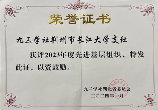 1月26日,九三学社湖北省第八届委员会第三次全体(扩大)会议在武汉召开。湖北省政协副主席、社省委主委秦顺全代表九三学社湖北省委作工作报告,中共湖北省委统战部副部长李涛应邀到会指导。会上,九三学社湖北省委对荣获2023年度社省委先进集体和先进个人荣誉称号的集体和个人进行表彰,九三学社荆州市伟德体育支社获评“先进基层组织”荣誉称号。